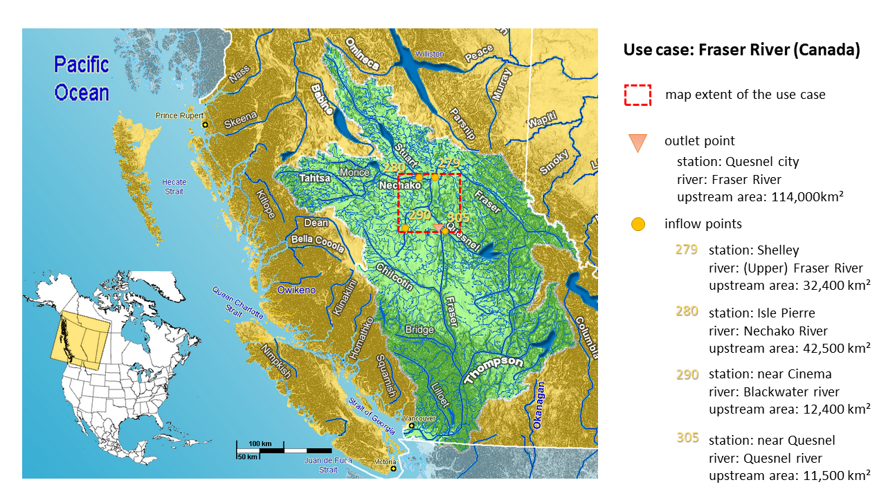 The first use case is located in West Canada, in a basin called Fraser. The Fraser River rises at Fraser Pass near Blackrock Mountain in the Rocky Mountains and discharges into the Pacific Ocean at the city of Vancouver. With its 1,375 km length, it is the longest river within British Columbia and the 11th longest river in Canada. The basin size is about 220,000 km2, while the annual discharge at its mouth is 3,550 m3.