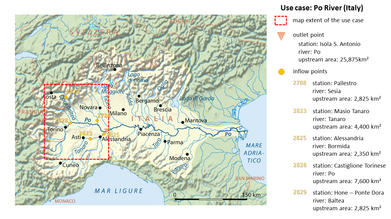 Also for this use case we have selected only a portion of the whole river basin. You can see the selected area in the map above as it is outlined with a red dashed box. It includes a large part of the Upper Po River basin till the outlet at Pieve del Cairo on the main Po River. The area upstream of the outlet is 25,875 km². However, as not all of the very upstream sections are fully included in the map extent (you see that some are outside of the red box) five inflow points were defined (see map). At those locations a pre-calculated discharge time series will be used that accounts also for all the upstream areas.